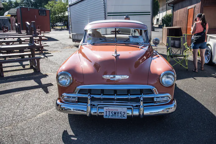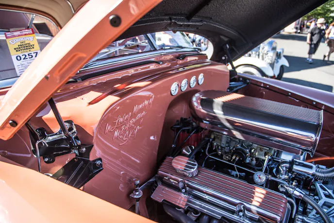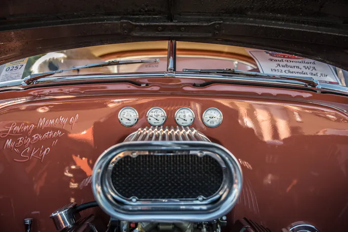There’s a lot more to this ’52 Chevy Bel Air than meets the eye. The car belongs to Paul Droullard of Auburn, Washington, and the backstory about how he got the car is a big part of what makes it so special. “My brother was Skip Droullard, a well known car guy in the Pacific Northwest. He bought this car eight or ten years ago, and it was ugly under the hood and hardly ran,” Paul explained. “Skip had the firewall and inner fenderwells smoothed, and that was the same time he added a Mustang II-style front suspension to it.”