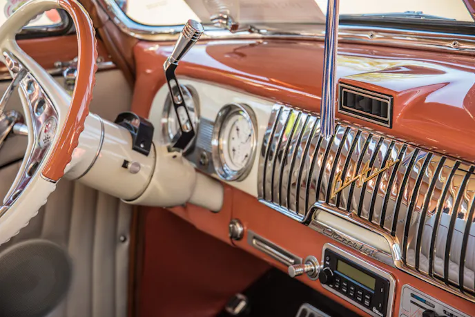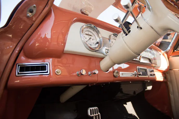 The dash extension also made room for built-in air vents. The steering wheel is also a custom touch, it's out of an Impala.