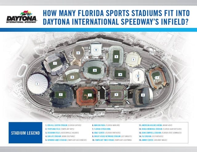 That helps to put into perspective how big Daytona really is in a geographical sense. If they did put all these stadiums inside Daytona, we are pretty sure that would be the worlds worst parking lot jam. Luckily for race fans, there are no such plans.