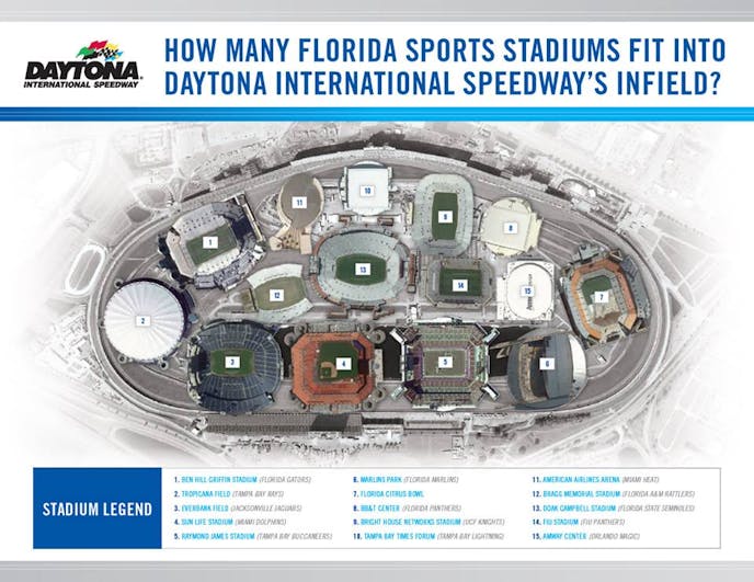 With its high banking and 2.5 mile long course, Daytona is one of the largest tracks in the NASCAR series. But you have to ask yourself, exactly how big is Daytona? When NASCAR started comparing Daytona to other Florida sports stadiums, they found out just how big it really is. In fact, you could fit fifteen other major Florida stadiums inside the 180 acre infield of Daytona. Here’s a list of all the stadiums that would fit inside Daytona: