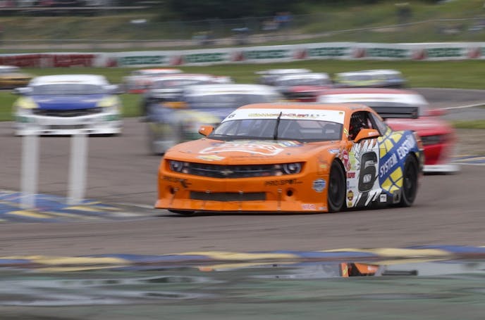 The V8 Thunder Car Series they sponsor is a class in which Chevy Camaros, Ford Mustangs and Dodge Challengers all compete. These are all the latest renditions of the car as well. In the case of the Camaro they are based off a 5th Gen.