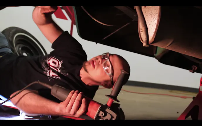 While Bill bolts the new mounting brackets to the rear axles, Damien gets to work notching the frame. “You will notice that these brackets are different,” Bill points out on the axle. “The right side, or passenger side, has the panhard bar mount.”