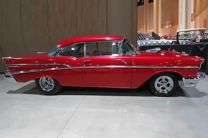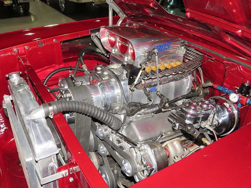 The earliest of the Tri-Five Chevy era, this bright red 1955 150-series cruiser has just the right upgrades to make it a fantastic choice for Saturday night cruising. A freshly rebuilt 402 cubic-inch engine gives this car plenty of street-performance cred, and all the additional chrome in the engine bay is just icing on the big-block cake. Modern niceties, such as the electric cooling fans, overdrive transmission, power steering and brakes, and aftermarket air conditioning keep the smiles per gallon ratio pegged for the entire ride. Listed as Lot Number F364, this ’55 Chevy is sure to become someone’s favorite ride.