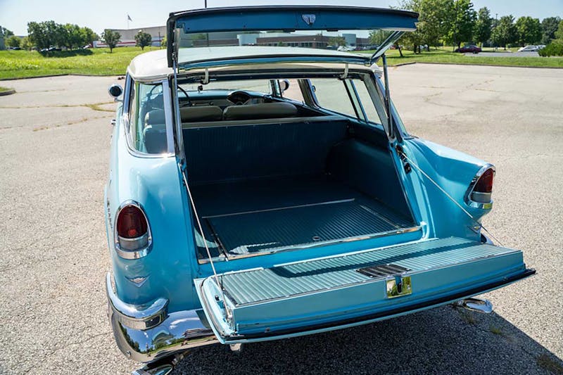 Considered the halo model for the Tri-Five Chevy era, this 1955 Chevrolet Nomad has all the features to make a truly premium trim package. As Chevy’s first entry of the “Sport Wagon,” this Chevy Bel Air Nomad features all the powered goods, such as the seats, windows, brakes, and steering. It also features options including factory air conditioning, an outside sun visor with dash-mounted E-Z eye glass, an Autronic eye for auto-dimming headlights, an auto compass, a fender-mounted antenna, front and rear fender guards, and special two-tone paint, consisting of Cashmere Blue and India Ivory. This highly optioned 1955 Chevy Bel Air Nomad is offered as Lot Number F905.