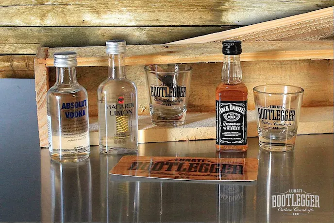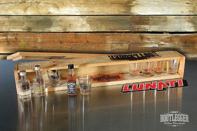 - Bootlegger Wooden Cam Box, One Bootlegger Shot Glass, Bootlegger T-shirt, Lunati Banner, Lunati Hat