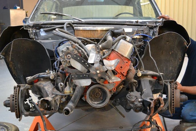 But before the body and frame can be pulled apart, the team must disconnect the two pieces by way of the wiring, fuel line, emergency brake cable, and most importantly, the body mounts.