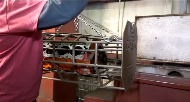 malibu_monday_smyth2_2Once secured inside, the engine gets blasted with heat up to 620 degrees Fahrenheit, which burns everything from dirt to paint off the engine. Once its been baked, the block then moves on to the “clean room” where all new plugs will be put back into the engine.