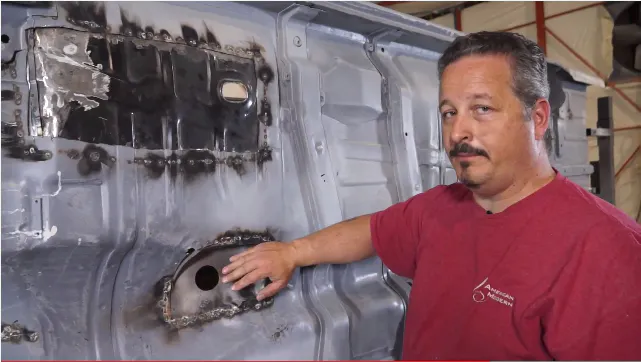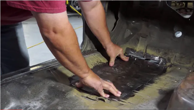 With the floor pan patch cut out and laid in place from last week’s episode, Claims Specialist Rick Drewry carefully clamps and welds the patch into place. But the patch doesn’t completely cover the hole that was made by removing the rusted metal, so the crew has to cut an addition patch and fit it into place. Once this is done, it is welded into place and then the crew is able to move on to the shifter hump replacement.