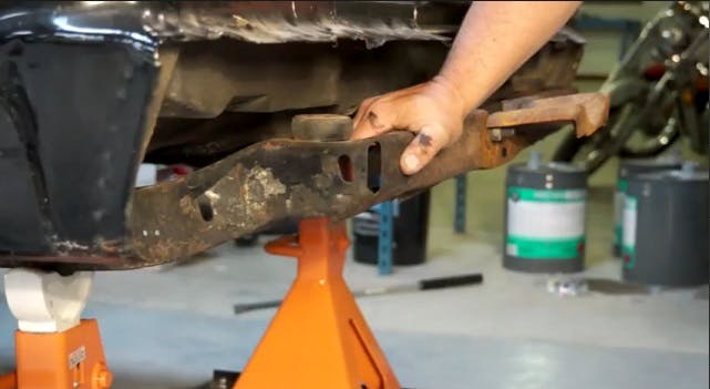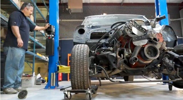 With the body mounts all off, pulling the body from the frame is as easy as lifting the two pieces apart via an automotive lift. Once the frame and body are separated, it’s a bit easier to see all the damage that the car sustained in its accident, especially to the frame. Luckily, the crew has a donor frame stripped and ready to go.