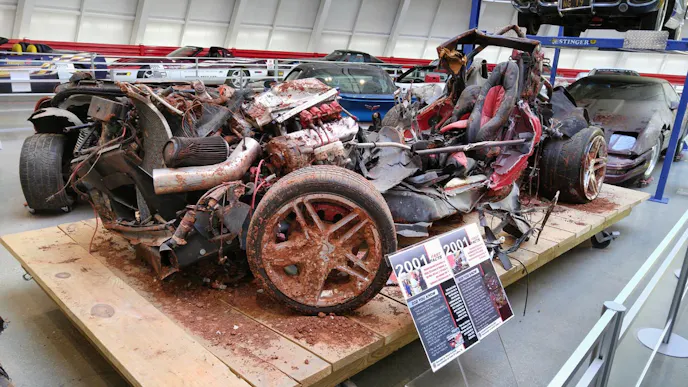 Before this Z06 took on the mangled face of fame, like all eight of the Corvettes, it was a prized exhibit inside the NCM Skydome. Prior to that, it was in the loving hands of Kevin and Linda Helmintoller of Land O’ Lakes Florida. They enjoyed the car, but not necessarily by racking up highway miles. Rather, they modified their Corvette by handing it over to Chuck Mallett for the entire Mallett Hammer treatment on top of an AntiVenom Performance 436 engine.