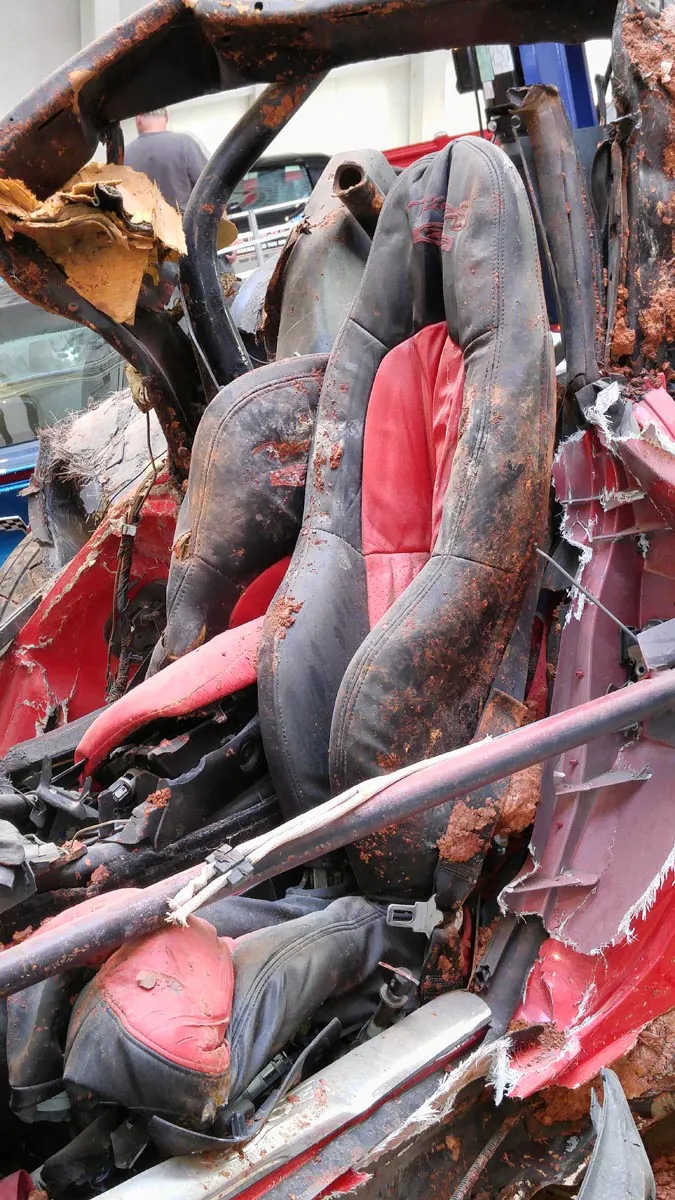 The frame that once kept all four wheels in alignment now bends and contorts in an attempt to simply keep all four wheels connected. Those once comfortable sport seats have been folded upon themselves to the point where even an inch-worm would struggle for enough support. The car now resides on a platform to allow moving it around under human power, all its 700 horses having escaped somewhere through the sinkhole.