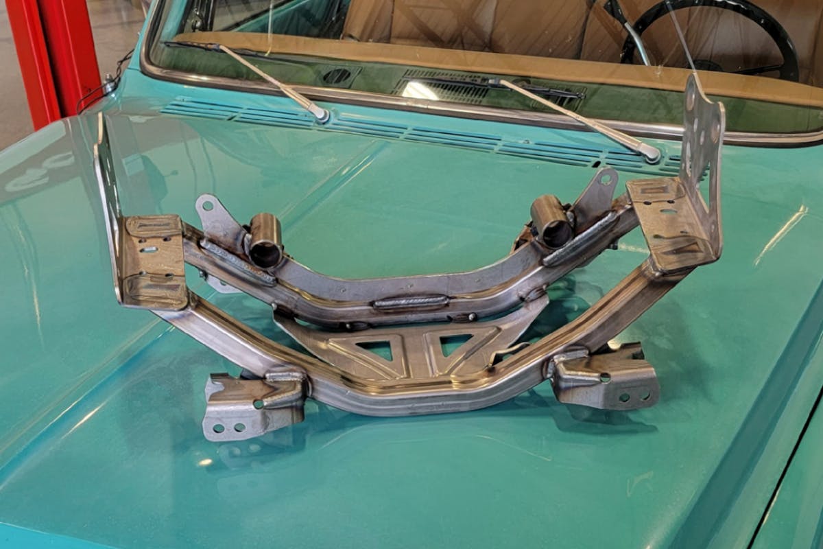 We were fortunate enough to get a sneak peek at a new tubular crossmember that is being developed for 1963-1972 and 1973-1987 C10 trucks. This is not just another run-of-the-mill part. For you handling junkies, this comes with an integrated rack-and-pinion steering. Like I said, I got a sneak peek which means it is not available yet, but it should be by the end of summer. The crossmember will be available as a complete kit with everything you need for the front end of a stock truck (crossmember, steering rack, control arms, shocks, springs, etc). If you already have a QA1 suspension under your hauler, don’t worry, this new crossmember is also compatible with QA1’s existing coilover kits. That means you can use an available retrofit kit to update your existing QA1 setup with a couple of minor bolt-on mods to the shocks and control arms.