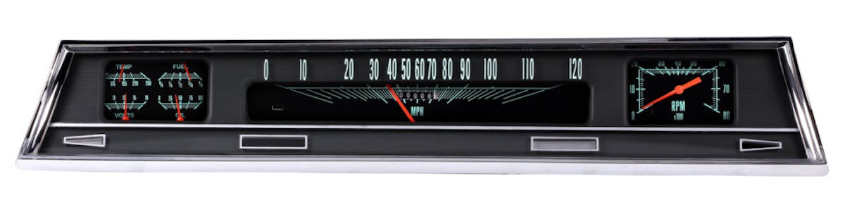 This all-new product was debuted at the 21st Goodguys PPG Nationals in Columbus, Ohio. The all-electric, direct-fit cluster features a speedometer and tachometer, fuel, oil, temperature, and volt gauges in one of four available styles. The cluster is ready to install directly into the stock dash of ’66 and ‘67 Chevelles.
