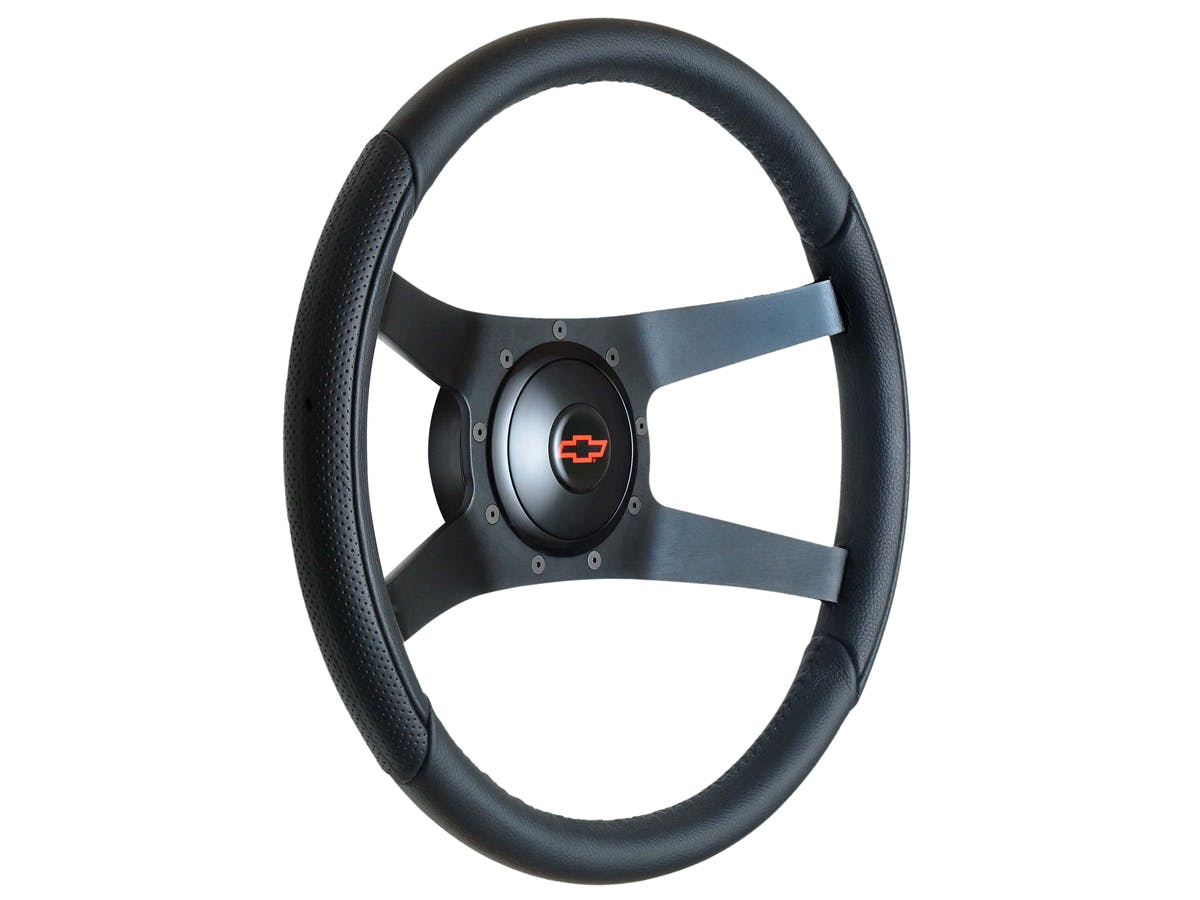 This GT Pro-Touring Sport steering wheel (Model 52-5375) is inspired by GM’s iconic oval 4-spoke sport wheel used on the Camaro, Corvette, Chevelle and Nova/Chevy II during the ‘70’s, but is now available with a thoroughly modern flair. The GT Pro-Touring’s engineered construction features 5086 black anodized aluminum spokes, riveted to an inner steel channel with molded polyurethane grip. Perforated, ergonomically shaped handgrips help to reduce driver fatigue, while the deep-dished spoke design increases strength and rigidity.