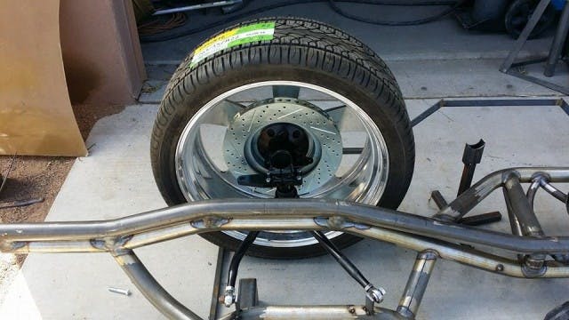 We’ve just pulled the photos of the 4130 chromoly chassis and roll cage to show you what to expect when you roll into Vegas for this year’s SEMA show. The Overkill crew is really proud of the TIG welded cantilever rear suspension and the front struts on bags. They’ve added an aluminum quick change Ford 9-inch rearend with a spool and 410 gears.