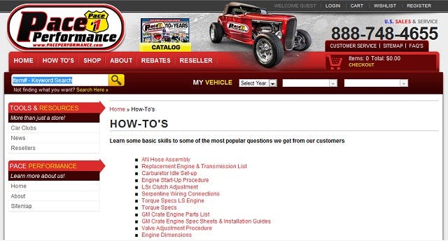 Pace Performance covers everything from the three basic elements of plumbing your car to crate engine spec sheets in their How-To section. Some of our favorite how-to topics are Carburetor Idle Setup, Torque Sequence and Specs, and GM Crate Engine Installation Guides.