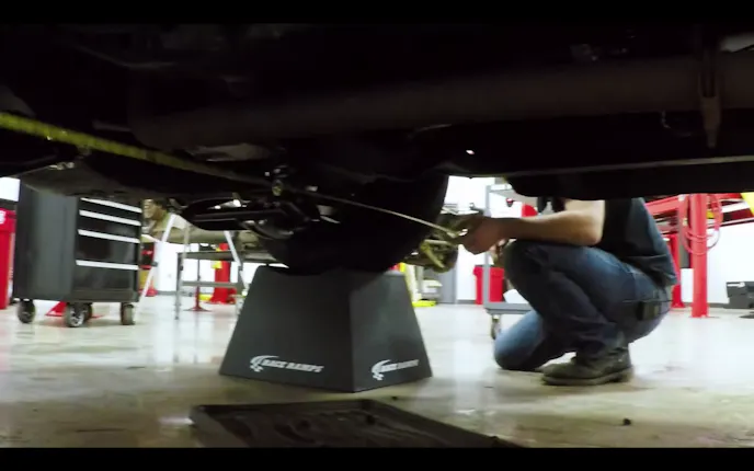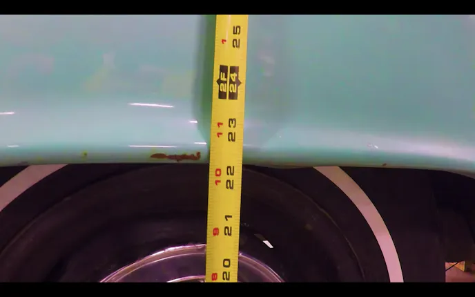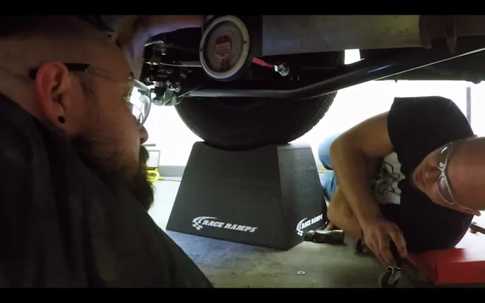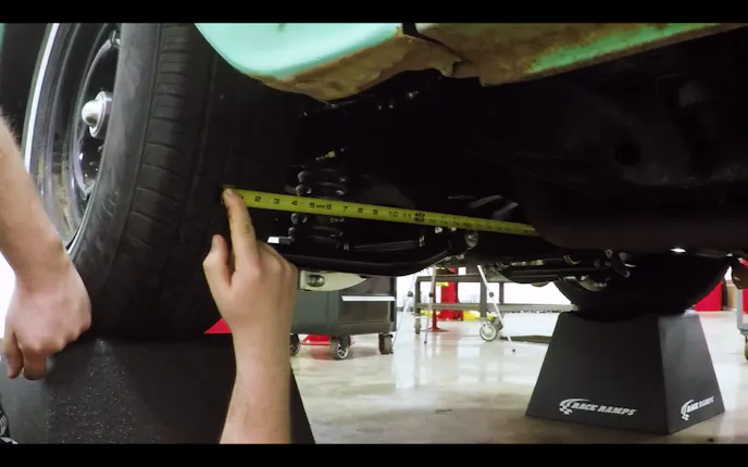 One of the first adjustments to make is to set ride height. Next, you’ll want to measure the camber to ensure it is within the window of negative 1/2-degree to negative 1-degree. To measure camber, Damien uses a small chain magnetically affixed to the fender.