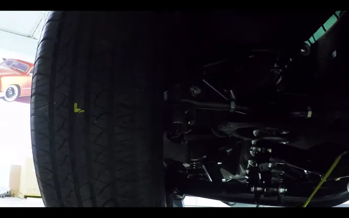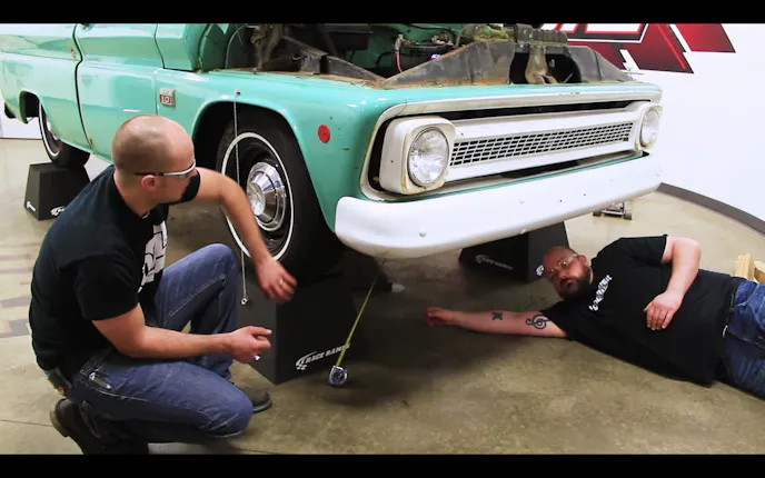 After setting camber, you’ll want to look at the toe. “To set the toe, we’re just going to do it with the old tape measure method,” Damien explained. He marked a spot on the front and rear of the tires on both sides so they can measure left to right. You’ll want toe to measure roughly 1/16-inch different from the front of the tire to the rear, with the front being the smaller measurement. “Also make sure your steering wheel is centered before you take the measurement,” Bill said.
