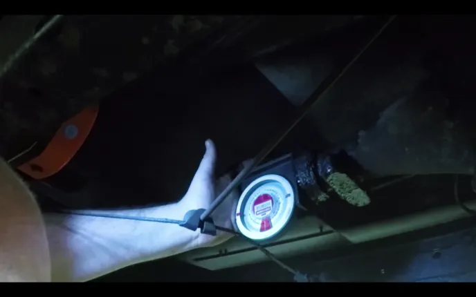 With the driveshaft back in, the driveshaft itself measures between 0 and 1-degrees. Bill then measured the angle of the rearend pinion and got an angle of between 2 and 3 degrees. The difference between the output shaft and the pinion is roughly 3 degrees, and the goal is to land in the sweet spot, between 1 1/2 degrees and 2 1/2 degrees.