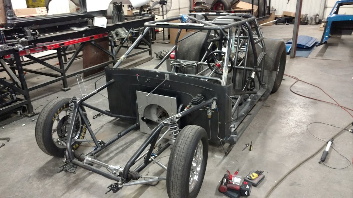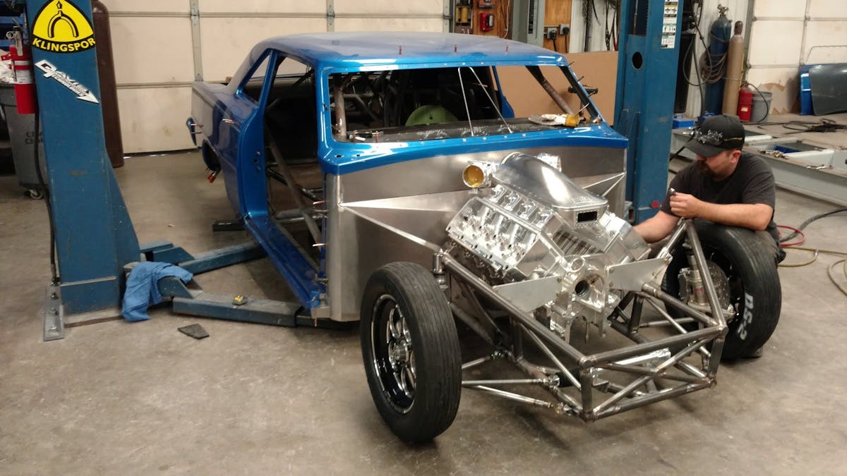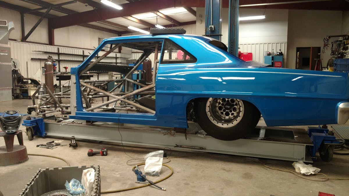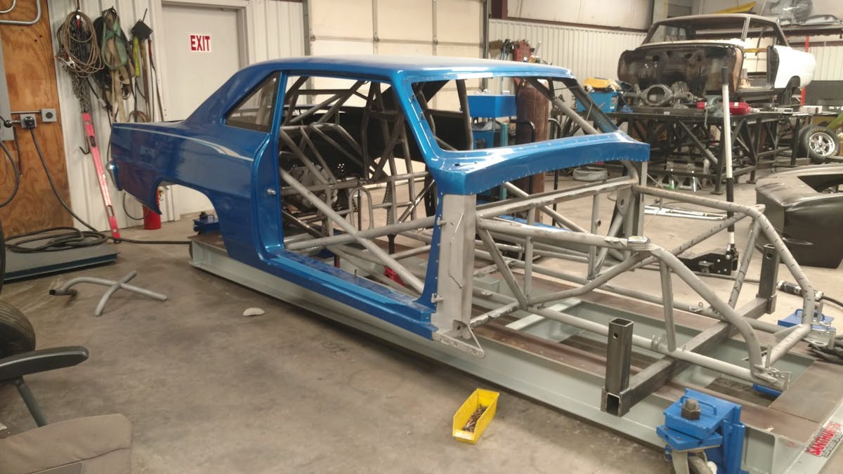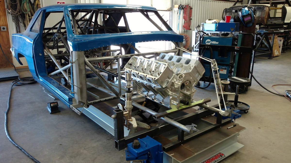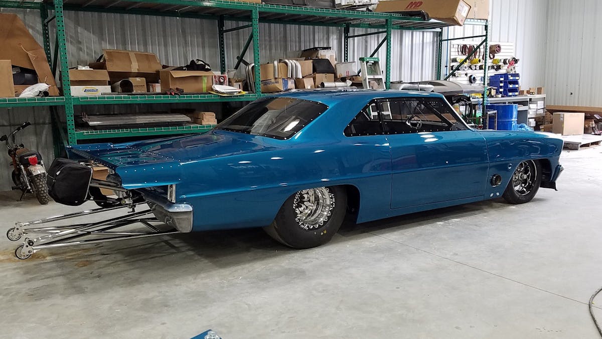 “This chassis started out as a homemade deal when Grant brought it to us. We began working on the chassis and converted it to a 25.2 certified double frame rail chassis. We reworked the front half of the chassis, added Lamb Components shocks, struts, and brakes to it along with a Tim McAmis Performance Parts full floater rearend. To go with all of our in-house built suspension parts, we added a Mark Williams Enterprises anti-roll bar in the rear. The body on the car is a fiberglass Tim McAmis 1967 Nova that we had painted by Andrew Teal in-house as part of our new turn-key car program.”