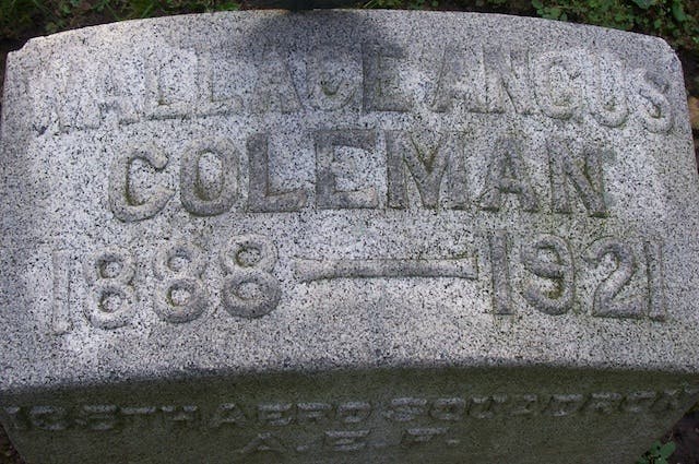 Grave marker for Wallace Coleman. Photo from {link=https://www.findagrave.com/cgi-bin/fg.cgi?page=pv&GRid=108708255&PIpi=78884845}Find A Grave{/link}