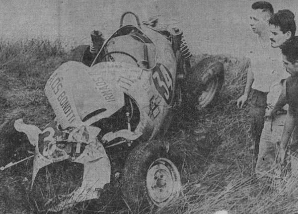 As a result of his qualifying run, Chamberlain started on the pole position of the race. A last minute addition to the event, Barton was starting scratch but did not intend to remain there long.On the first lap, just after the flag flew, even before the field had reached the first turn, there was a five-cap pile-up. The first row got off to a bad start and Barton came busting up on the inside. The accordion-effect caused Barton to hit Davis, who in turn was pushed into the rear of Al Chamberlain’s car. Chamberlain’s car bounced off Wyrembeck’s car, turned sideways, jumped over the inside railing and rolled.