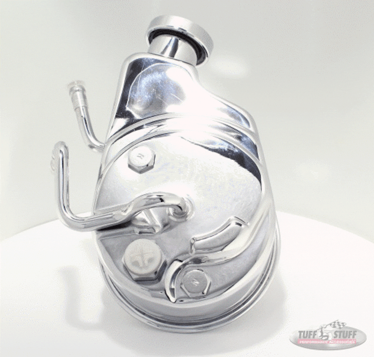 The pump/reservoir assemblies are available in either chrome plating or Stealth Black powdercoat. These pumps have a ¾-inch OD shaft for use with a press-on pulley. They also have a factory 5/8-18 inverted flare pressure port and two 3/8-inch OD return tubes. The new-and-improved pump reservoir is made from 20-gauge cold-rolled steel and is furnace-brazed for premium quality. Pumps are rated at 1,200 PSI at 3 gallon-per-minute, feature all new components, and include a chrome-plated billet-aluminum cap and dipstick. These power steering pumps will also work on any custom-built project equipped with aftermarket hydroboost brake system. All Tuff Stuff power steering pumps are built in Cleveland, Ohio.