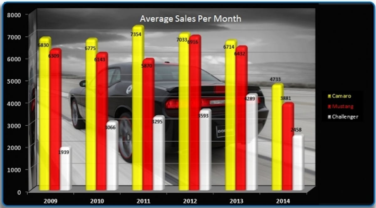 Sales per month from 2009 to 2014 and the sales figures from 2014 show the current trends. Yellow is Camaro, Red is Mustang, and White is Challenger. Graphs are from www.camaro5.com