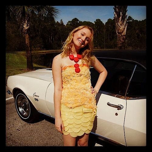Curiosity got the best of us, and we had to figure out why women would create cheese dresses and pose in front of classic cars. We started by searching, “Girls wearing cheese dresses.” Quite a few results popped up and we started going to websites that were hosting them, and seeing what the users had to say. While most had some really cheesy comments, we were able to figure out the reason for this. The cheesy dresses are apart of a world wide scavenger hunt.