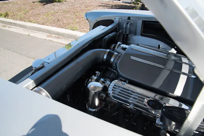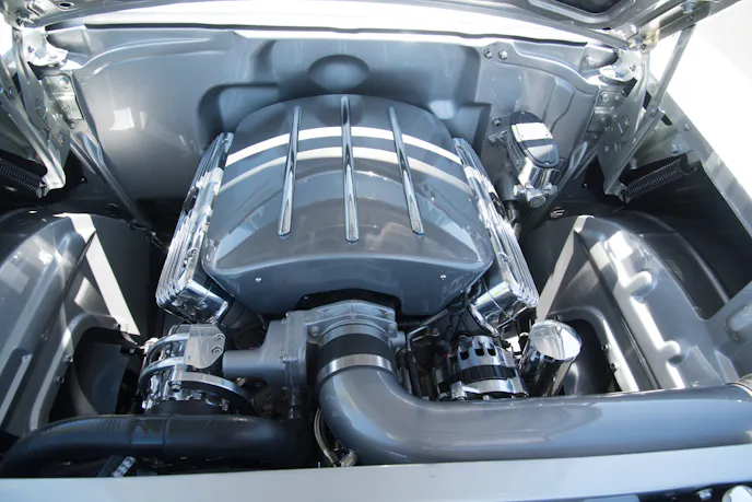 The exterior of this ’57 Chevy features a few subtle body modifications. The hood humps and rear fins have been reshaped with peaks instead of the rounded top. It’s a subtle change that most wouldn’t notice, but it sets the car apart from others, and really finishes out the aesthetic of this extremely clean and simple build. The paintwork was done by Darryl Hollenbeck’s Vintage Color Studio, and is a light silver over a dark silver, for a two-tone that’s hard to differentiate in one light, and starkly contrasted in another.