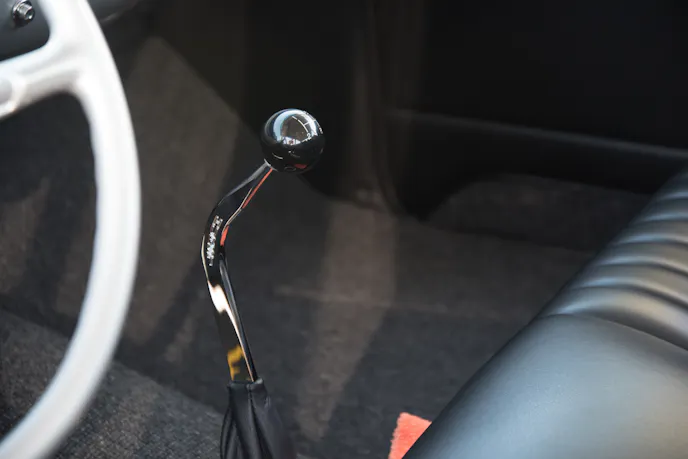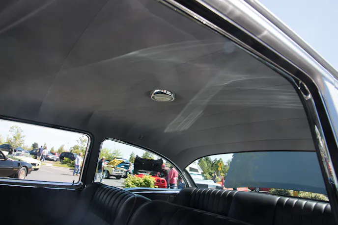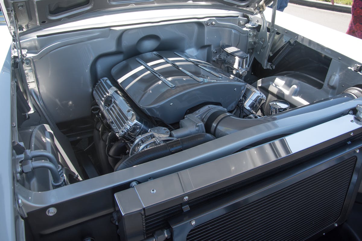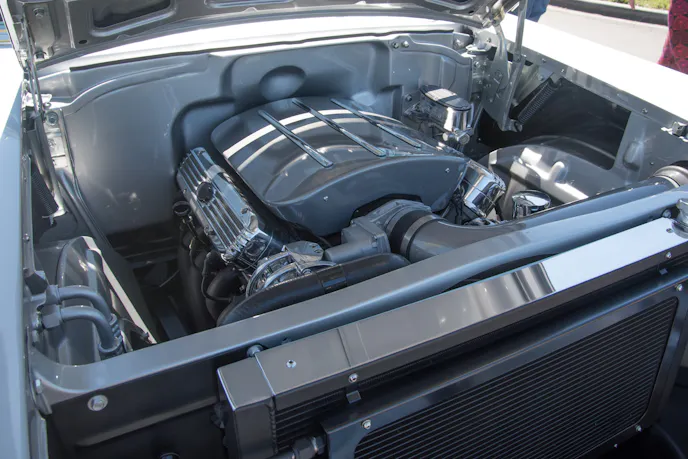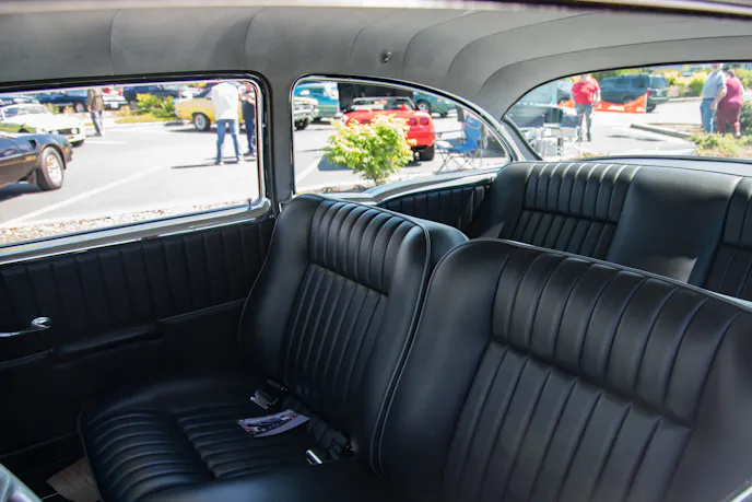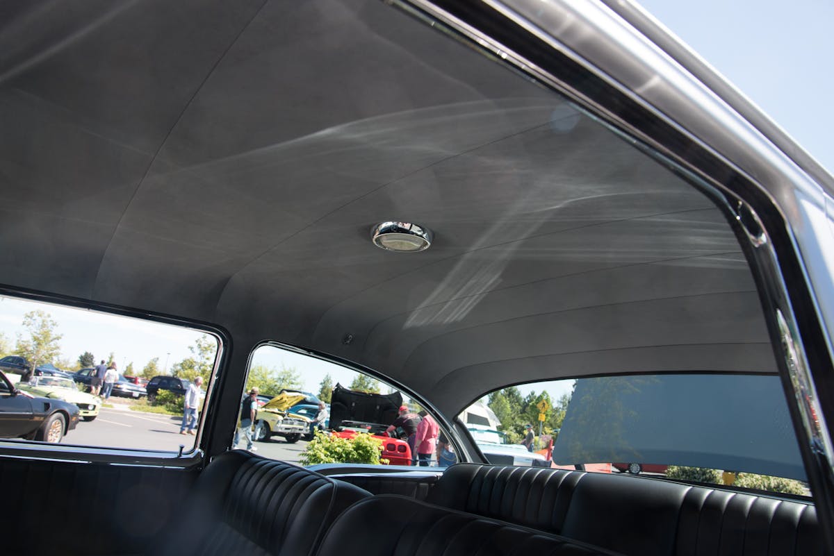 The upholstery was done by Sid Chavers Upholstery. It’s all leather, and the split bench has been modified for greater comfort. It’s not the same old flat-backed bench seat anymore. The added bolstering on each side better cradles the driver and provides more support. The headliner is also a rich suede instead of the old vinyl or cloth headliner that is often found in a 1957 Chevy.