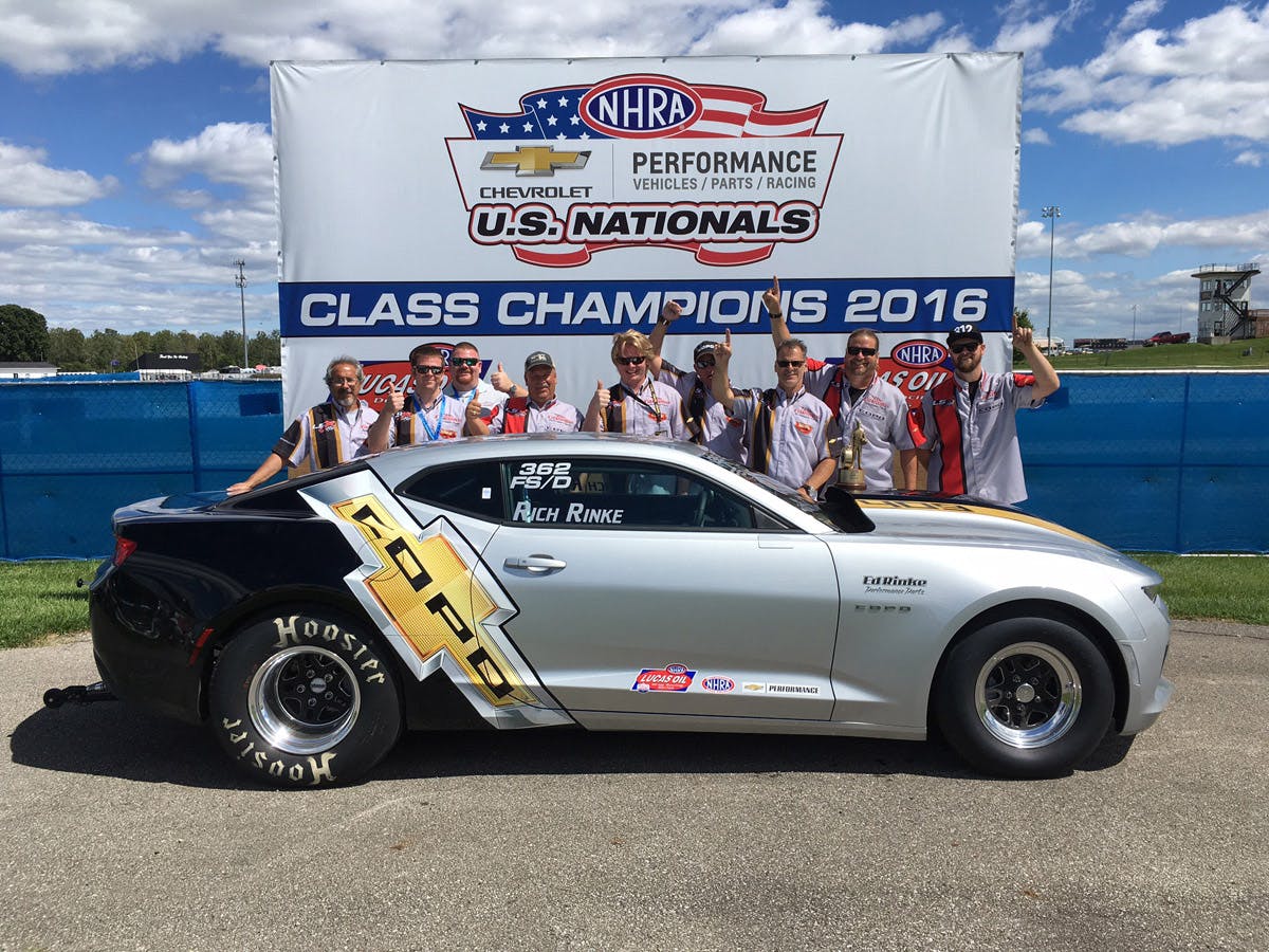 If you were fortunate enough to attend the 2016 Chevrolet Performance U.S. Nationals in Indianapolis, then you were also witness to some cut throat racing, and an overall good weekend for Chevy fans. Rich Rinke of COPO Parts Direct, piloted his new COPO Camaro to a win in the FS/D Stock Eliminator class. According to Rich, “The car was running great all weekend, we had the suspension tuned just right, I couldn’t have been happier.” When the lights were tripped at the end of the quarter-mile during one pass, the car ran an astounding 9.42-second e.t. at a tire-melting 142 mph. This was the car’s debut race, and Rinke defeated a field of four competitors to make his debut a winning event in the class.