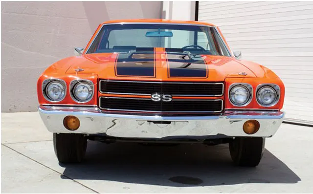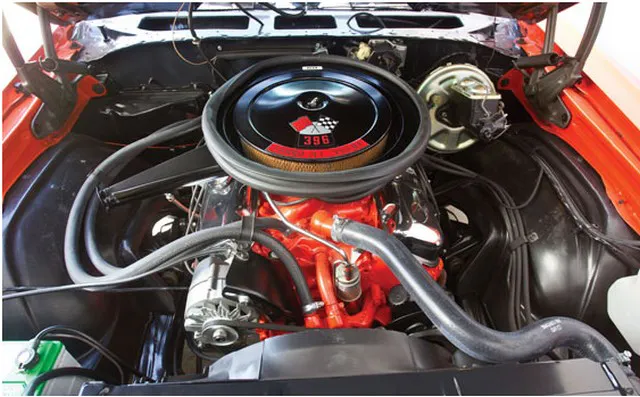 Pushing the engine’s power to the rear wheels is the original factory-optioned Muncie 4-speed transmission, while the cowl hood, SS wheels and Hugger Orange paint scheme with black stripes maintain a classic performance look for this unique Chevy.