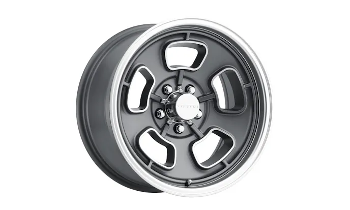 Vision Wheel American Muscle 148 Shift Wheels add a modern touch to the classic five-slot wheel. The one-piece aluminum wheels have a satin gray finish and those classic “D” holes accented with machined faces, plus a machined outer lip for an extra touch of class.