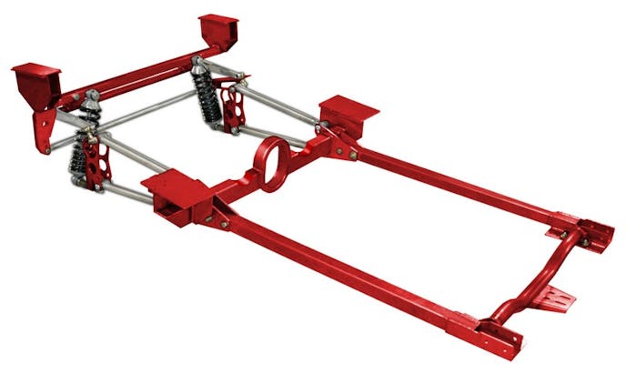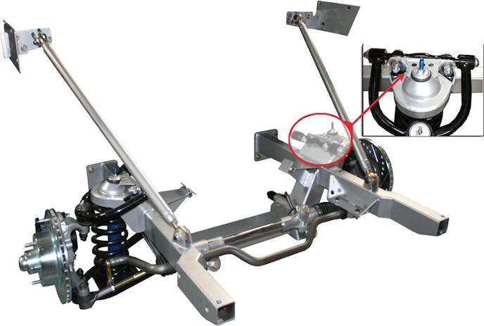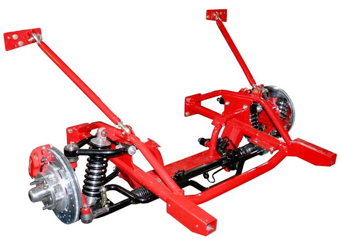 The Stage 1 package includes a bolt-on suspension with components like a crossmember, new upper coil-spring hat design, 1-inch tubular A-arms, 1 1/8-inch lower A-arms, 2-inch drop spindles, front sway bar, black powder coated springs, 11-inch drilled and slotted rotors, big bore calipers, adjustable down tubes and a power steering rack.