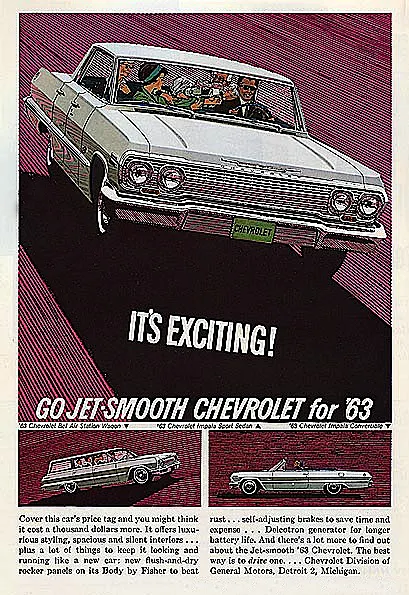 Lyons examined the ’63 Impala and noted that even though many Impalas of that year had the SS badge, it didn’t necessarily mean it was packing a punch. “For part of this decade – 1963, for instance – lifting the hood on an SS might reveal anything from a frugal, straight six, to a hair-raising, big-block V-8. Impala’s menu of engine choices for ‘63 included a 230 cid I-6 (140 hp), a 283 V-8 (195 hp), 327 V-8s (250-340 hp) and 409 V-8s (340-425 hp),” stated Lyons.