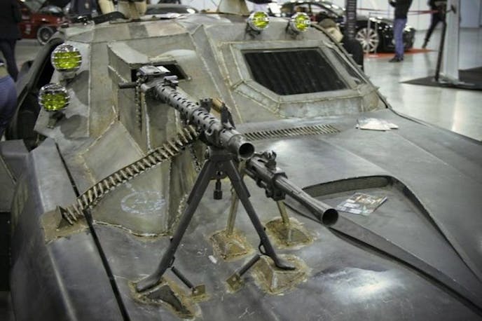 Mounted up top is a set of rockets, presumably heat guided. On the passenger side of the hood you’ll notice a set of welded in machine guns. With all this firepower, nobody will mess with you on the road. If they do mess with you, they will better have some serious protection. With a car purpose built like this, you don’t need to worry about paint. The quality of welds doesn’t seem to matter either judging by the pictures.