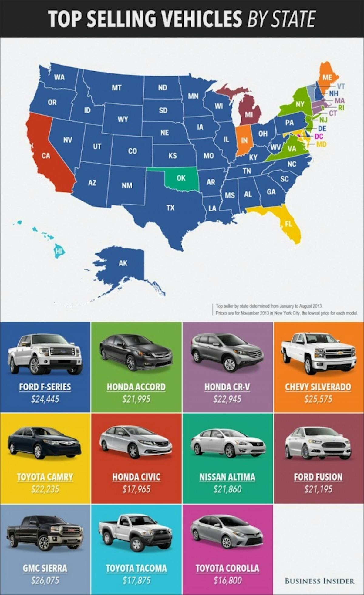 Unfortunately for us Chevy people, the Ford F-Series smoked everybody, winning over 30 states. The Ford Fusion also snatched up Ford’s home state of Michigan to add insult to injury. Perhaps the higher sticker priced Chevy hurt sales or people really wanted to try out an Eco-Boost F-Series. Whatever the case may be, Chevy got spanked this time. From the list, Nissan is the only company that had less states than General Motors.