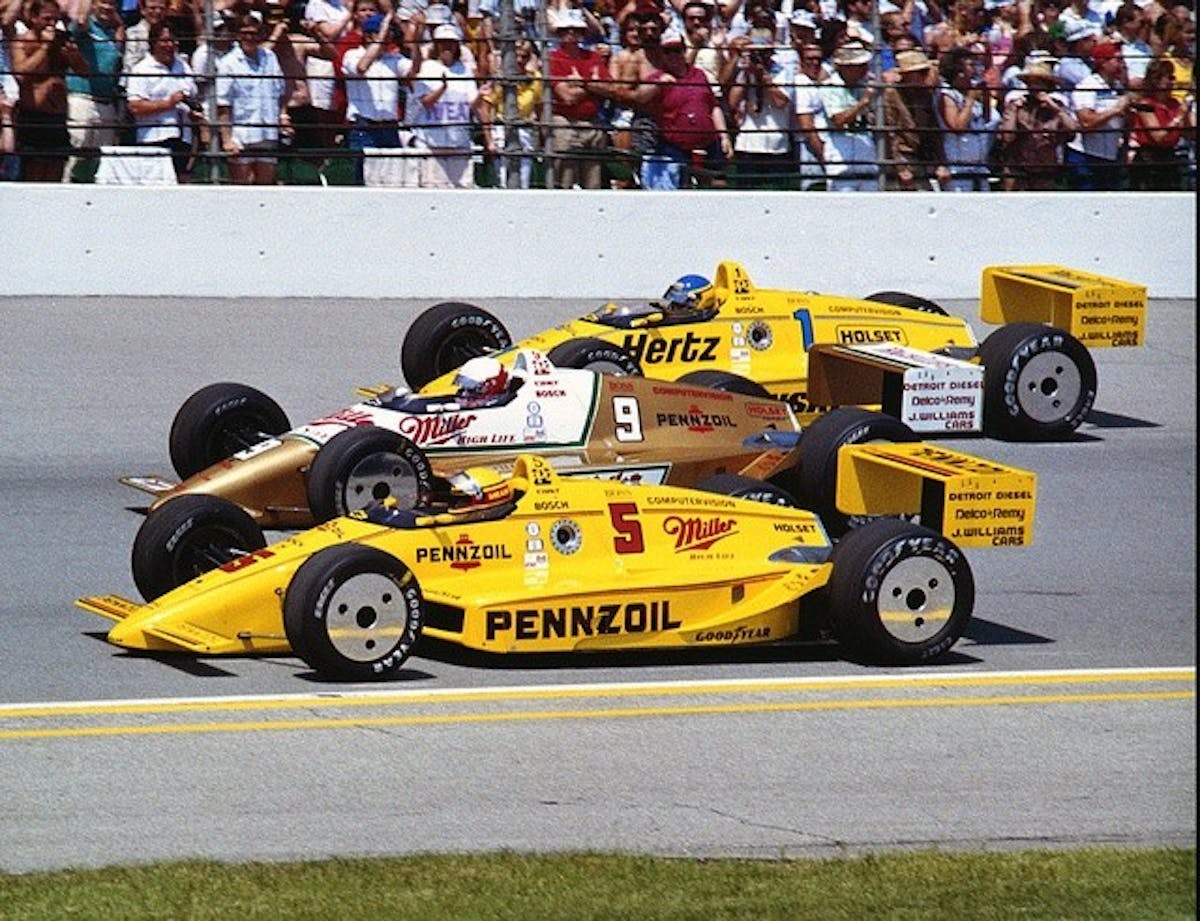 Rick Mears, Danny Sullivan, Al Unser all Penske front row for the 1988 Indianapolis 500. Photo from {link=https://www.flickr.com/photos/indianapolismotorspeedway/}Indianapolis Motor Speedway flickr page{/link}