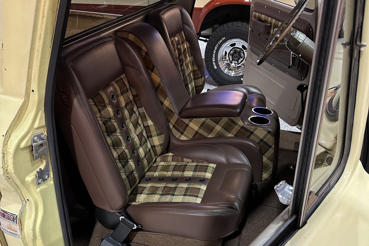 Parker's C10 uses a blend of brown with a plaid insert to blend the interior with the exterior color of his truck.