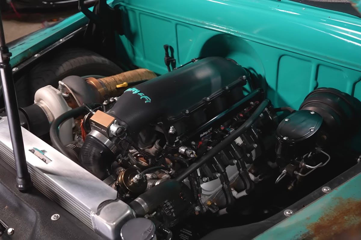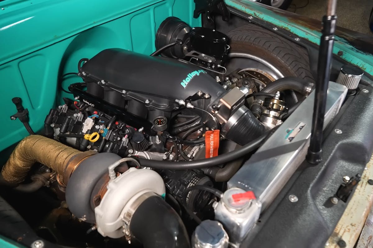 Under the weathered hood, you’ll find a surprisingly simple and effective powertrain. The heart of the build is a 4.8-liter LS engine with a stock bottom end, upgraded with a BTR Stage 2 cam. A 7875 GS Racing turbo provides the boost, with the filter element uniquely mounted through the passenger-side fender for a blast of cool air. Eddie estimated the truck’s output, saying, “I think she’s pushing a little past 500 at the tire.”