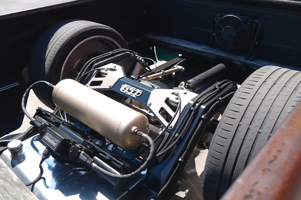 The truck’s aggressive stance and ability to lay its frame on the pavement come from a modern chassis and a well-sorted air suspension. Eddie replaced the original frame with GSI front and rear clips, providing a strong, modern foundation. An Airlift Performance system handles the adjustments. The thoughtful engineering on this Garage Built Turbo Chevy Apache Truck makes it a comfortable cross-country cruiser.