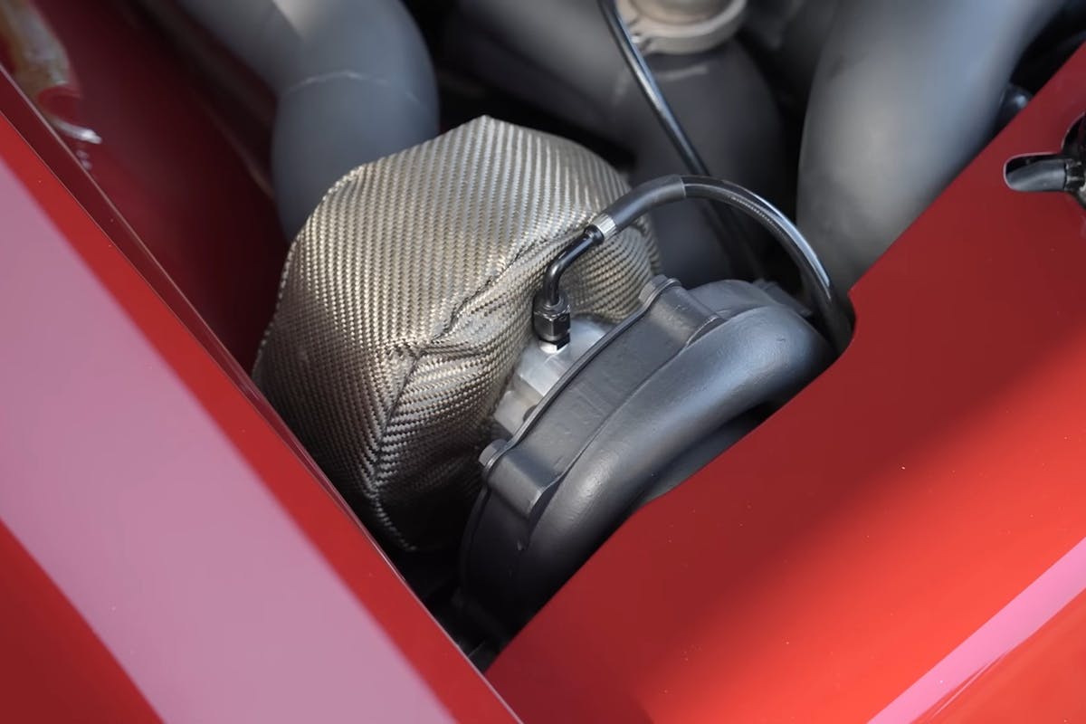 Under the hood, an LSX376 crate engine breathes through a trick Edelbrock cross-ram intake, with coil packs relocated for a super-clean look. Twin Comp T3 turbos force wind through the V8, making an easy 550 rear-wheel horsepower on pump gas and just six pounds of boost.