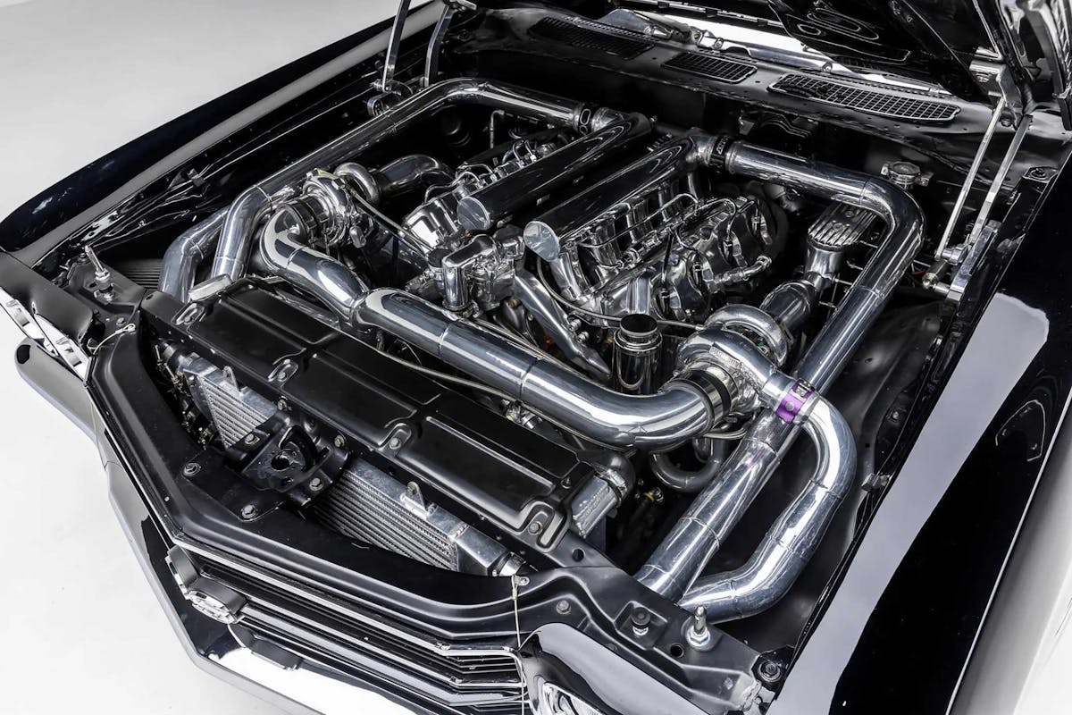 That’s because all that earth-rattling torque comes by way of a dual-turbo’d diesel engine. What started out as an LBZ Duramax engine, like what you’d find in a 2006 Silverado, has been fitted into the Chevelle chassis with just enough room under the hood to situate two turbos and all the requisite plumbing.
