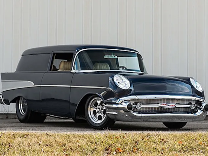 This redesigned ’57 Chevy that was recently put up for sale at the Mecum auction in Indianapolis, is an example of a heavily-modified car. The front end was streamlined, the hood ornaments were removed, and the suspension has been altered so it has a classic hot rod stance. Those of course, are not the first things you will notice about this custom. The original headlights were removed and replaced with headlights from a modern Mini-Cooper, creating a unique look. Unfortunately, unique isn’t always better, and the bug-eyed look leaves something to be desired. The rebuild was clearly done in a professional fashion, with no expense spared. Between the real wood interior furnishing, Dakota Digital dashes, and a 454 big-block V8 with a Turbo 40o automatic transmission and a 4.11:1 gear ratio, it really is a well put together car. We only wonder why they changed the headlights the way they did. DO you think the headlights are a nice feature, or should they have been left original?