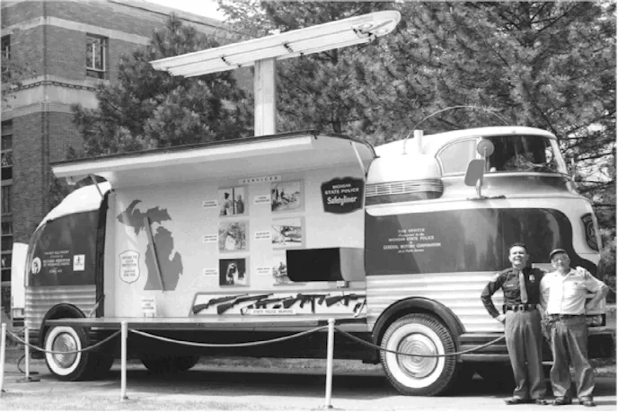 When the Parade of Progress was deemed to be of no more use, GM sold ten of the twelve Futurliners. The two that were not sold, were actually donated to the Michigan State Police. Under the care of the State Police, the Futurliners were renamed Safetyliners, and were then used as rolling displays to promote highway safety.