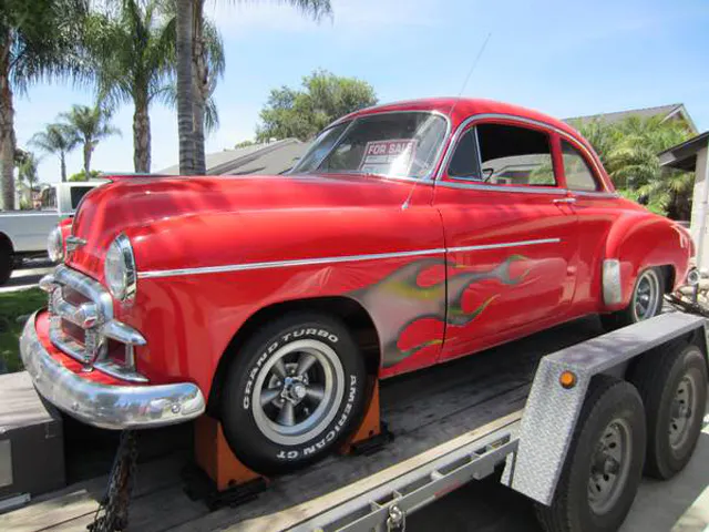 In a small suburban city 12 miles southeast of L.A., in a place called Whittier, you can find this delicious little 1950 Chevy hot rod. It’s a fine red flame-adorned Deluxe coupe, and for an asking price of just $6500, it’s got some great potential in the near future as a resto-mod. It’s a barn find from Montana, so a lot of the stock components can still be found in the car, among them the motor, radio, and those classic rock guards on the wheel wells.