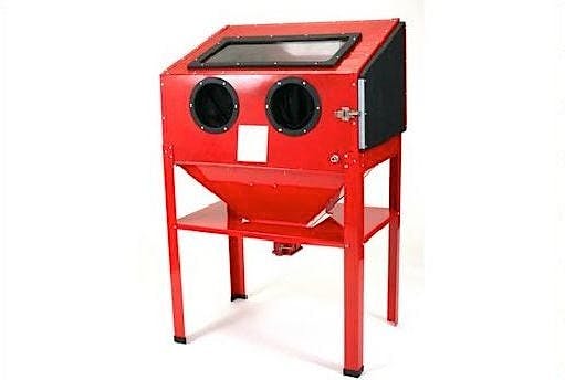 A bead blasting cabinet, or sand blaster, allows you to put a part into it then hit it with a gun that shoots a stream of sand. The beauty of this is that sand won’t go everywhere and you don’t have to wash sand out from your hair for the next month. Another benefit is that it recycles the sand, so you don’t have to keep buying more and more like a traditional outside set up.