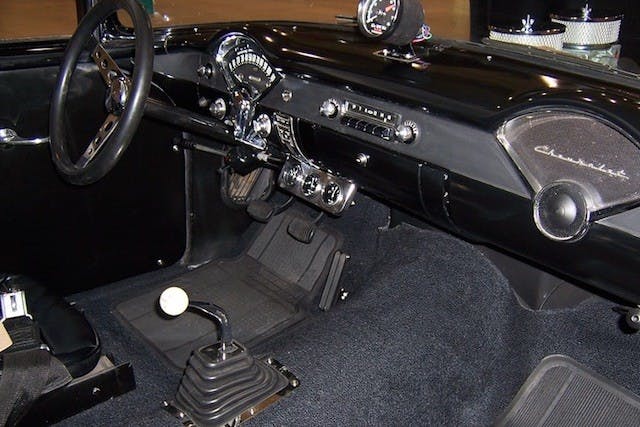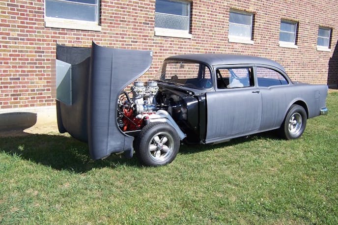 The two-movie star, a 1955 Chevrolet 150, two-door sedan. Photos from {link=https://twolaneblacktop.yuku.com/topic/26/Restoration-Photos-of-the-TwoLane-Blacktop-3955-Chevy#.VS1XoUJpouQ}twolaneblacktop.yuku.com{/link}