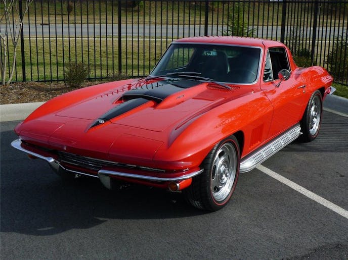 Imagine if Chevrolet had the technology in 1967 that they have today. Before you is that modern Corvette with all the right parts. This car started with a 1964 Corvette body and applied 1967 fiberglass to make it look like the infamous ’67 Corvette big block. Then it was covered in mirror-like Rally Red paint with a black stinger.